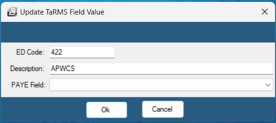 • APWCS & Other Employer Transaction Codes: These should have a blank TaRMS PAYE field allocated as per screenshot below.